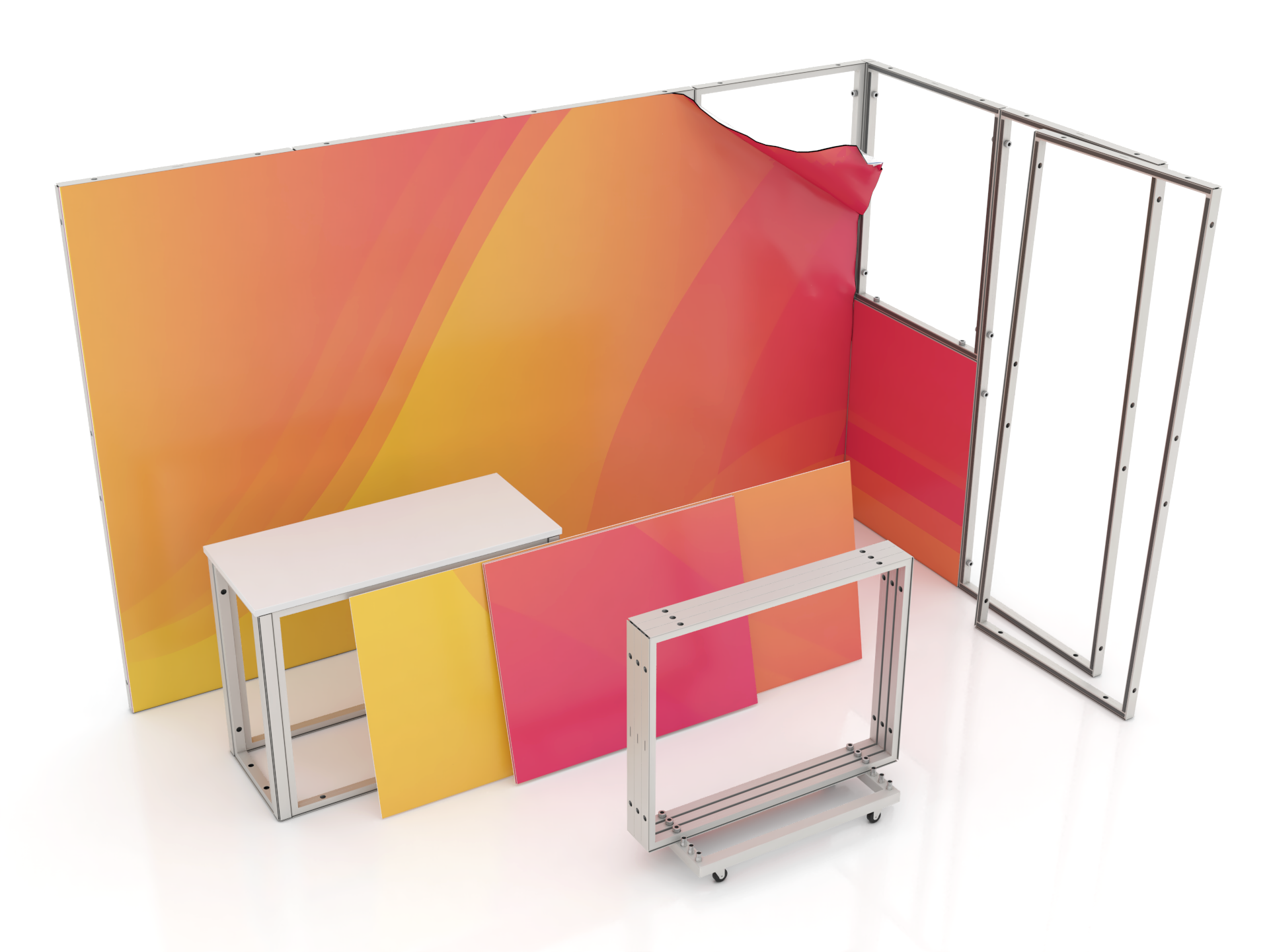 Modułowy system wystawienniczy do tworzenia stoisk targowych i eventowych. System oparty jest na idei ram aluminiowych wielokrotnego użytku, które można zestawiać w różnych konfiguracjach. Montaż jest prosty i intuicyjny – bez konieczności używania narzędzi. Dzięki wymiennym panelom graficznym montowanym do ram za pomocą paska magnetycznego łatwo możesz zbudować stoisko zgodnie z projektem. Co więcej, dzięki systemowemu wózkowi system jest łatwy w przechowywaniu i transporcie.